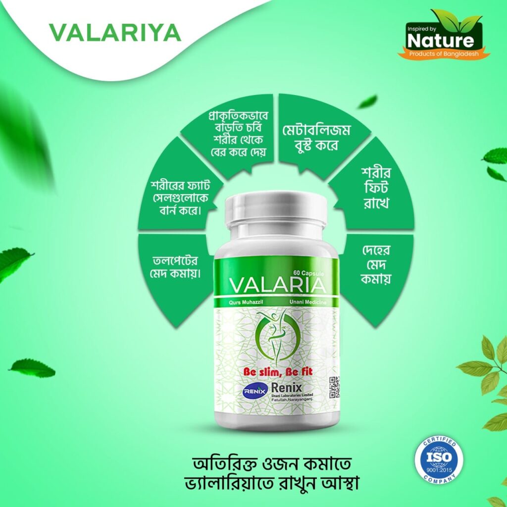 ভ্যালারিয়া শরীরের মেটাবলিজম বৃদ্ধি করে, অতিরিক্ত চর্বি গলাতে সহায়তা করে এবং নতুন ফ্যাট জমতে বাধা দেয়। এর প্রাকৃতিক উপাদানগুলো একসাথে কাজ করে ওজন নিয়ন্ত্রণে রাখে এবং শরীরকে হালকা ও সতেজ রাখে।